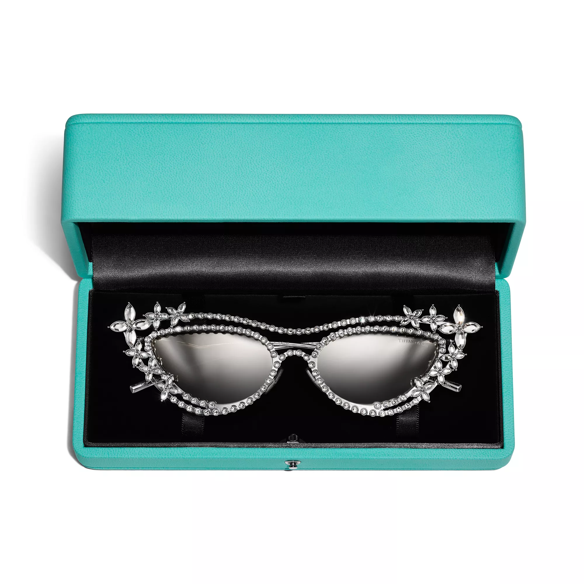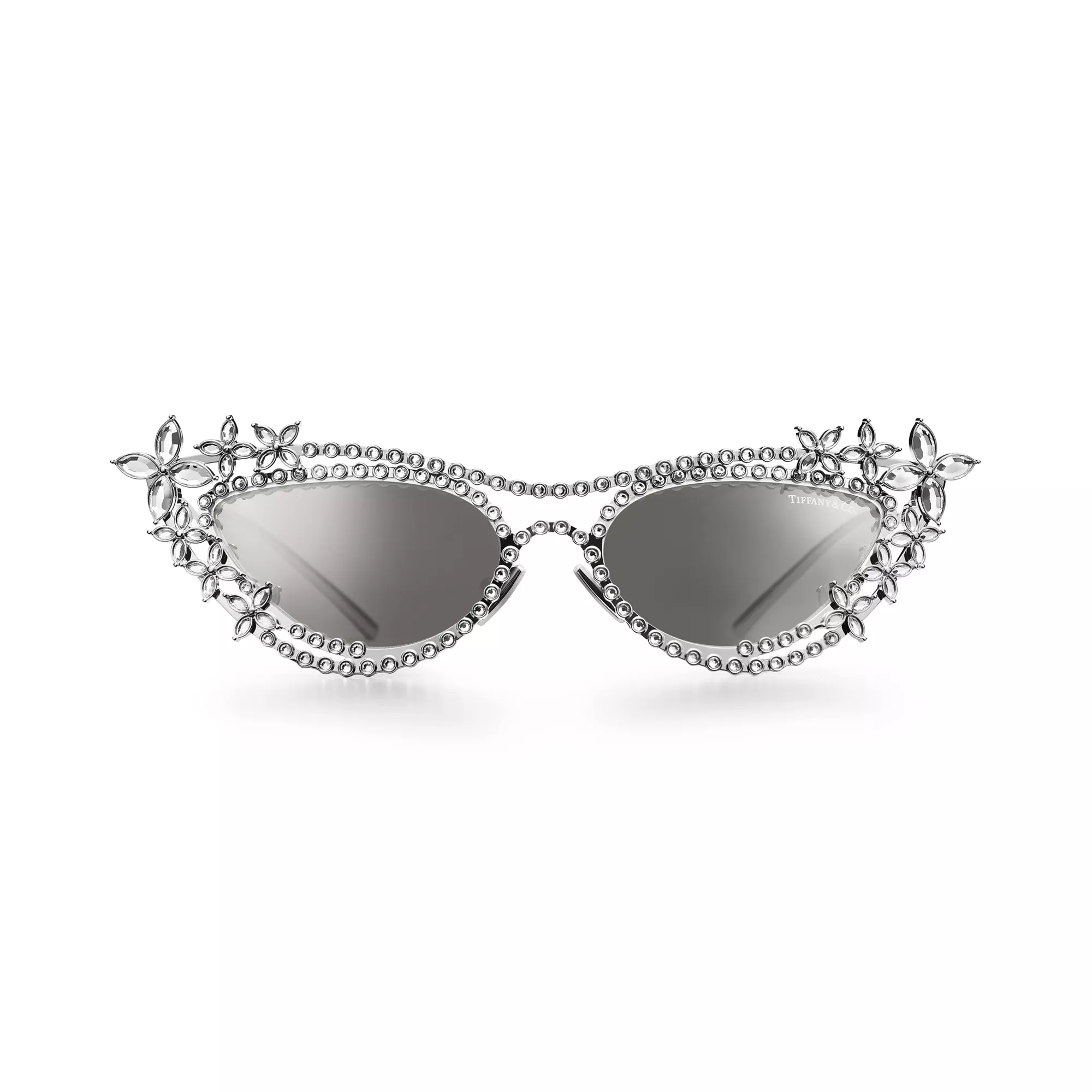 Ispirati ai leggendari tagli di diamanti di Tiffany, questi occhiali da sole cat eye in edizione limitata sono decorati con 172 cristalli incastonati a mano che evocano motivi floreali. Queste raffinate montature sono sapientemente realizzate in metallo placcato oro e presentano lenti a specchio platino.