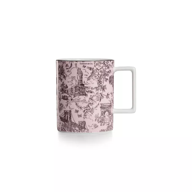 Le creazioni Tiffany Toile sono un estroso omaggio alla città di New York e alla sua tradizione. Elegante e divertente, l’immagine grafica si ispira a un’illustrazione della città di New York degli Archivi Tiffany. Il Ponte di Brooklyn con Bird on a Rock, la Statua della Libertà e al centro un diamante Tiffany & Co. Questa tazza color morganite è decorata da una stampa elaborata, con un bordo nero dipinto a mano. Abbina la tazza con un piatto Tiffany Toile per creare il tuo set personale.