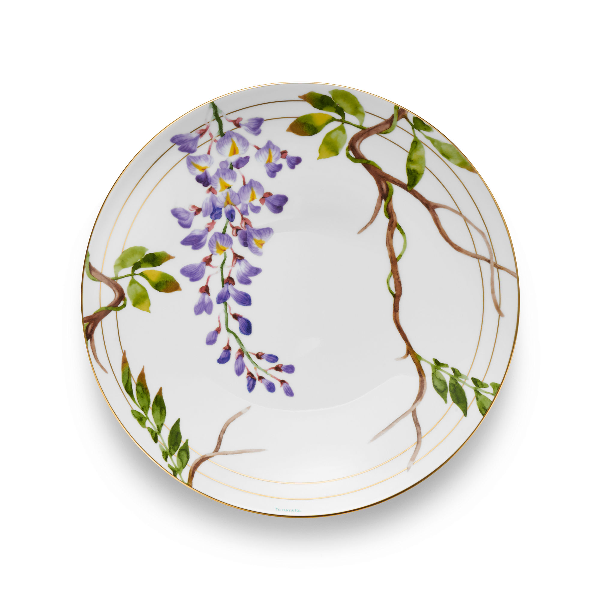 La collezione Tiffany Wisteria richiama i capolavori ispirati al fiore del glicine degli Archivi Tiffany. Nella rivisitazione di questo motivo, le immagini floreali dipinte a mano conferiscono alla collezione un’eleganza molto femminile e senza tempo. Questo piatto in porcellana di Limoges ha un bordo in oro dipinto a mano, che rende più elegante qualsiasi tavola.
