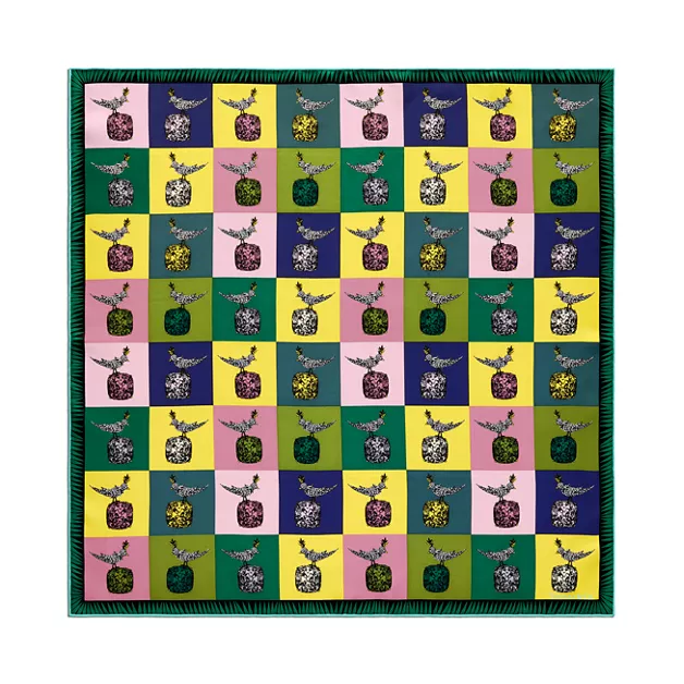 La spilla Bird on a Rock di Jean Schlumberger è una delle creazioni più iconiche della gioielleria del XXI secolo. Il gioiello, creato nel 1960, è stato da allora riproposto con le gemme di colore più belle del mondo. In questo vivace foulard in seta immagini della famosa spilla sono disposte in un motivo a griglia tipico della Pop Art. Da portare con un anello per foulard Tiffany o annodato ad arte alla borsa preferita.
