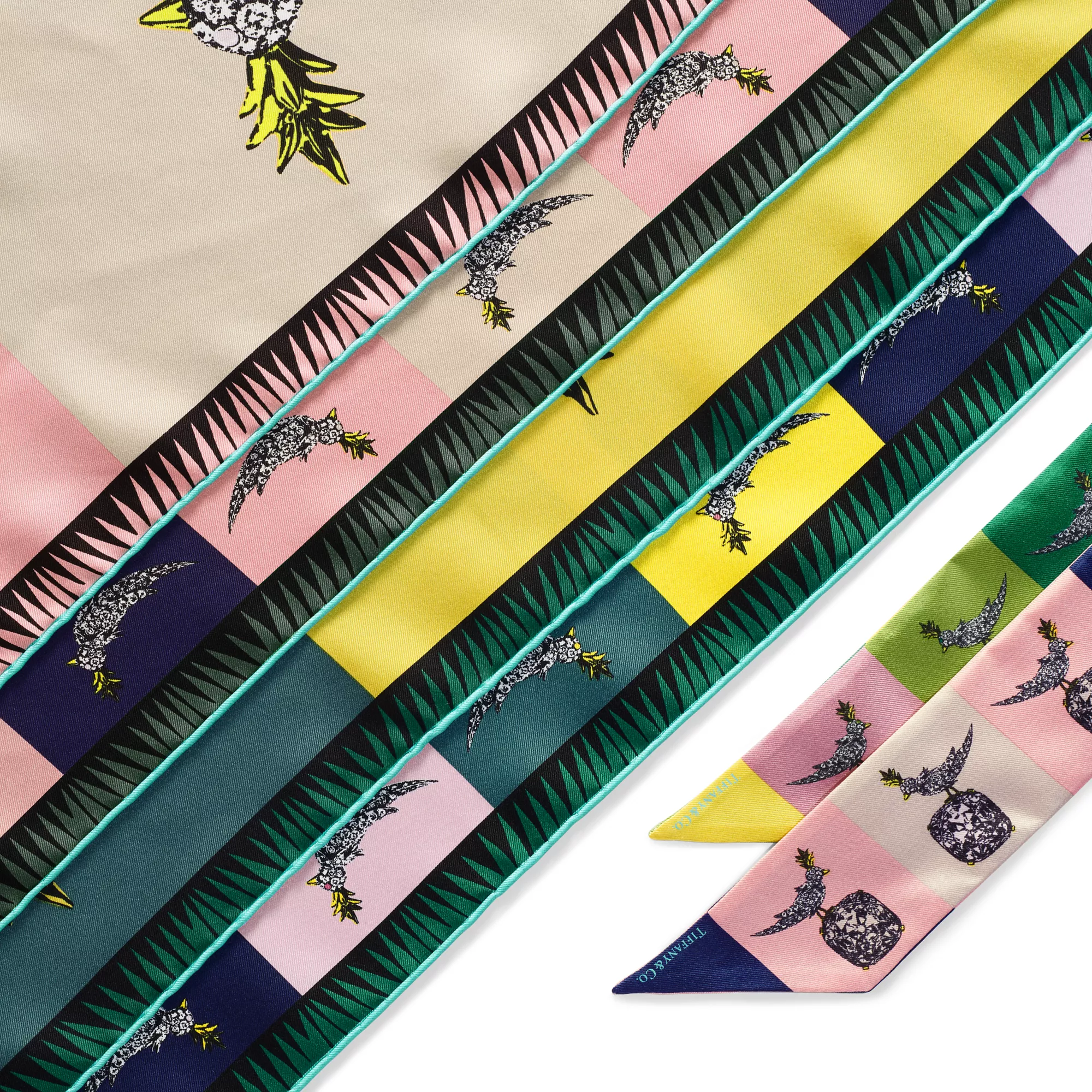 La spilla Bird on a Rock di Jean Schlumberger è una delle creazioni più iconiche della gioielleria del XXI secolo. Il gioiello, creato nel 1960, è stato da allora riproposto con le gemme di colore più belle del mondo. In questo bandeau in seta colorata immagini della famosa spilla sono riprodotte in stile Pop Art. Da portare con un anello per foulard Tiffany o annodato ad arte alla borsa preferita.