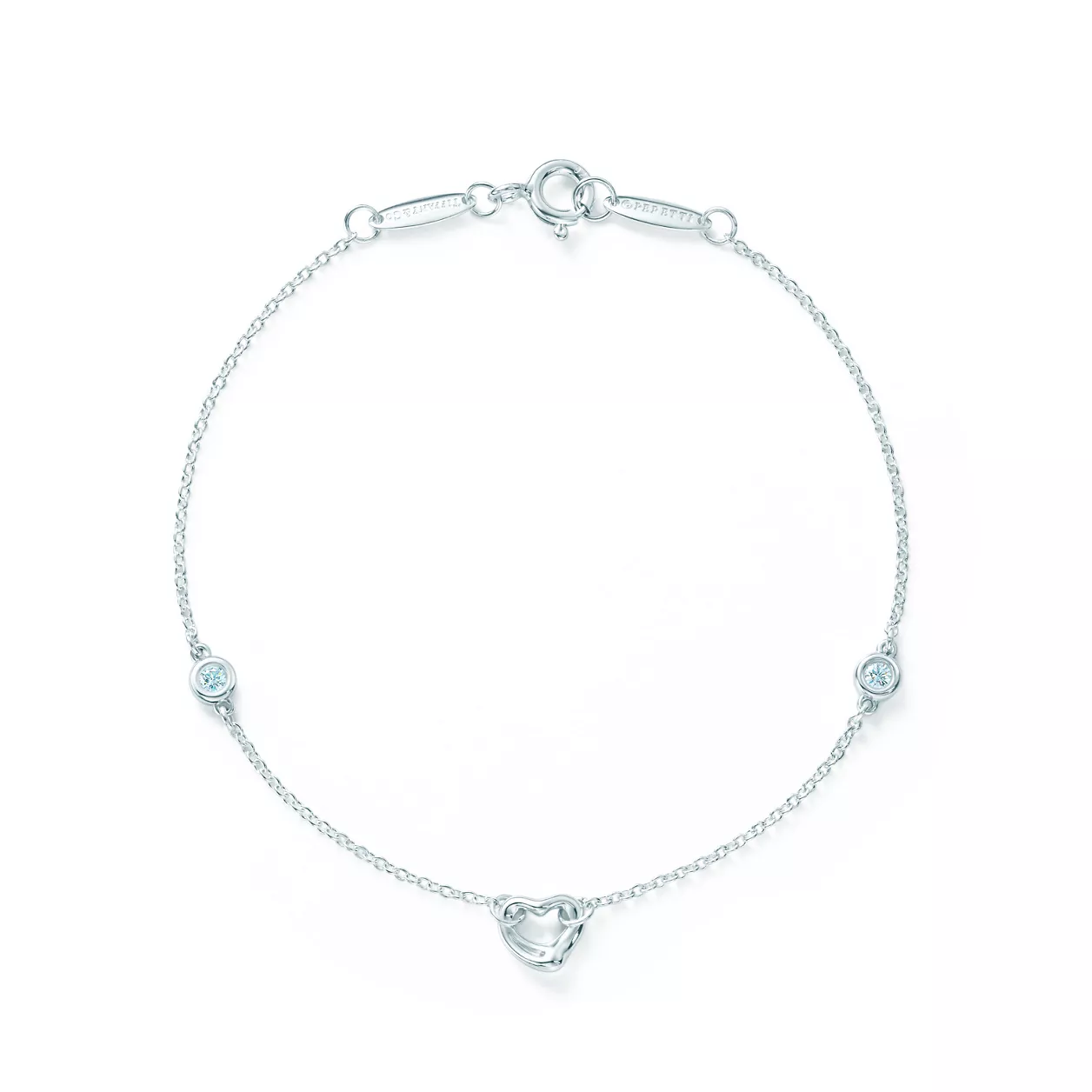 Bracciale in argento con due diamanti tondi taglio brillante. Lunghezza 17,75 cm. Cuori, 7 mm. Peso complessivo 0.06 ct. Modelli originali di Elsa Peretti coperti da copyright.