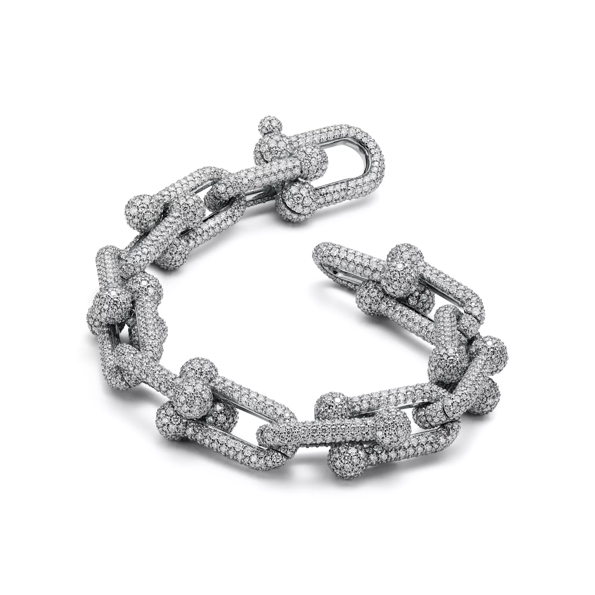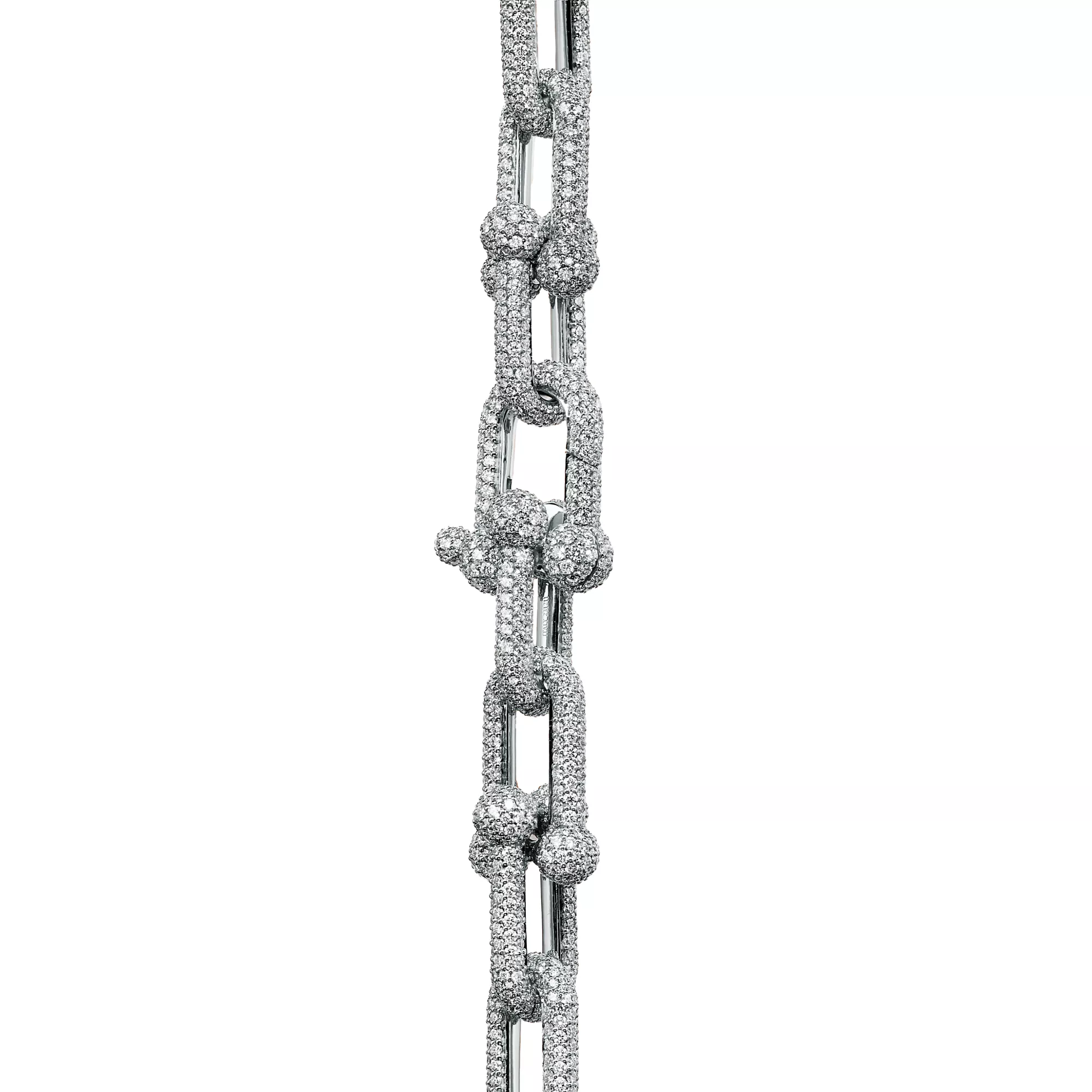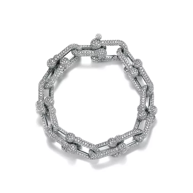 La collezione HardWear by Tiffany è un’espressione della forza dirompente dell’amore. Ispirata a un iconico bracciale del 1962 conservato negli Archivi della Maison, la collezione esprime la forza della resilienza e la capacità di sentirsi liberi. Questo bracciale in oro bianco 18k è caratterizzato dalle inconfondibili maglie industriali della collezione, in uno splendido contrasto tra il metallo e il pavé di diamanti. Gli artigiani di Tiffany incastonano accuratamente a mano ogni diamante per ottenere la massima luminosità. Una delle maglie nasconde la chiusura, creando un effetto di continuità. Questo bracciale è di grande effetto indossato da solo o abbinato ad altri metalli.