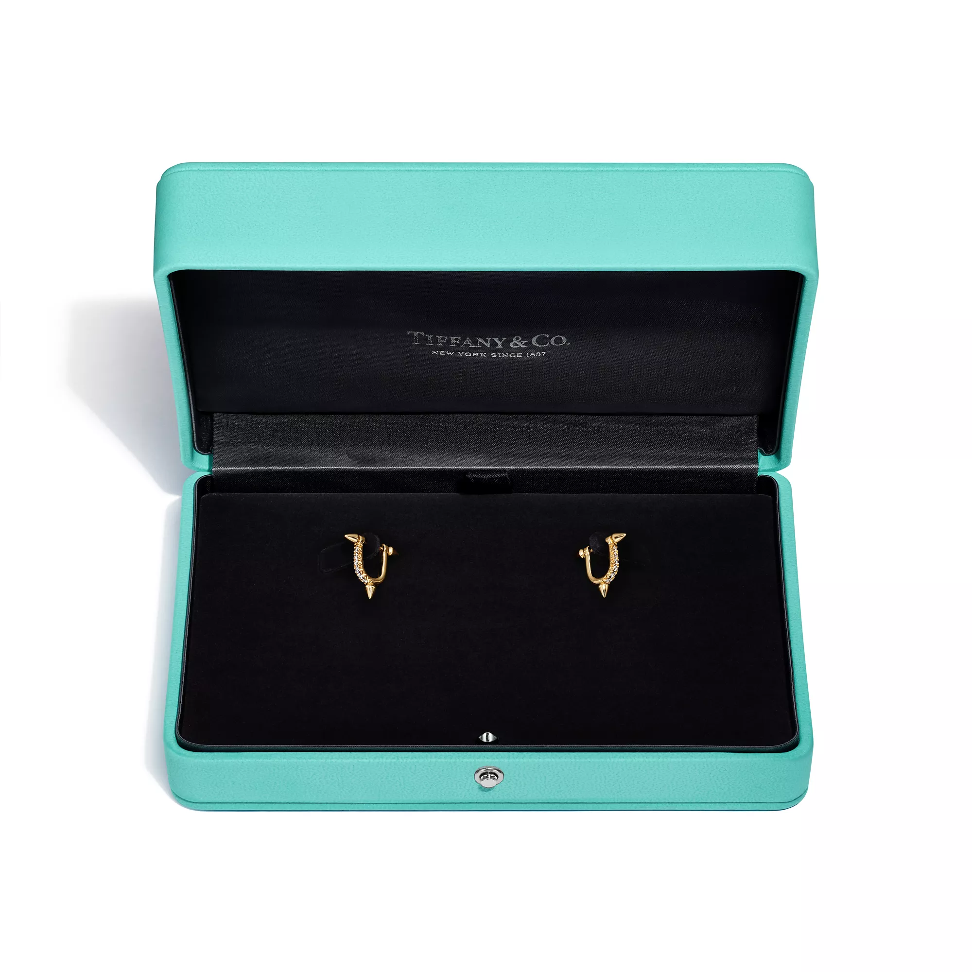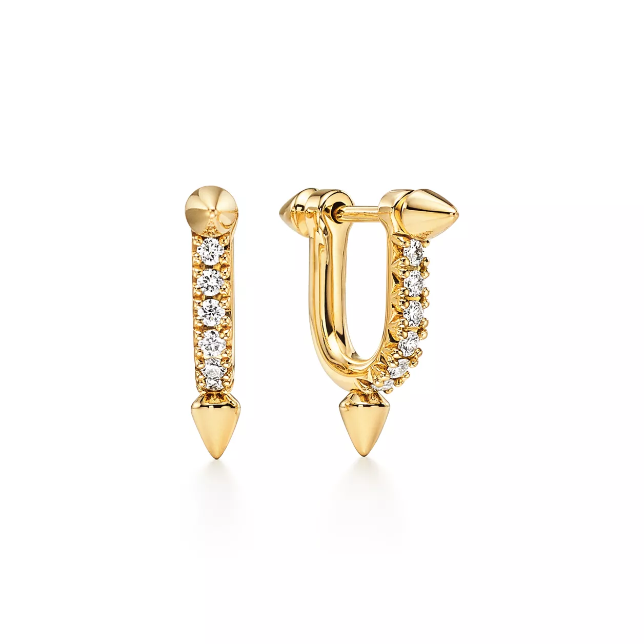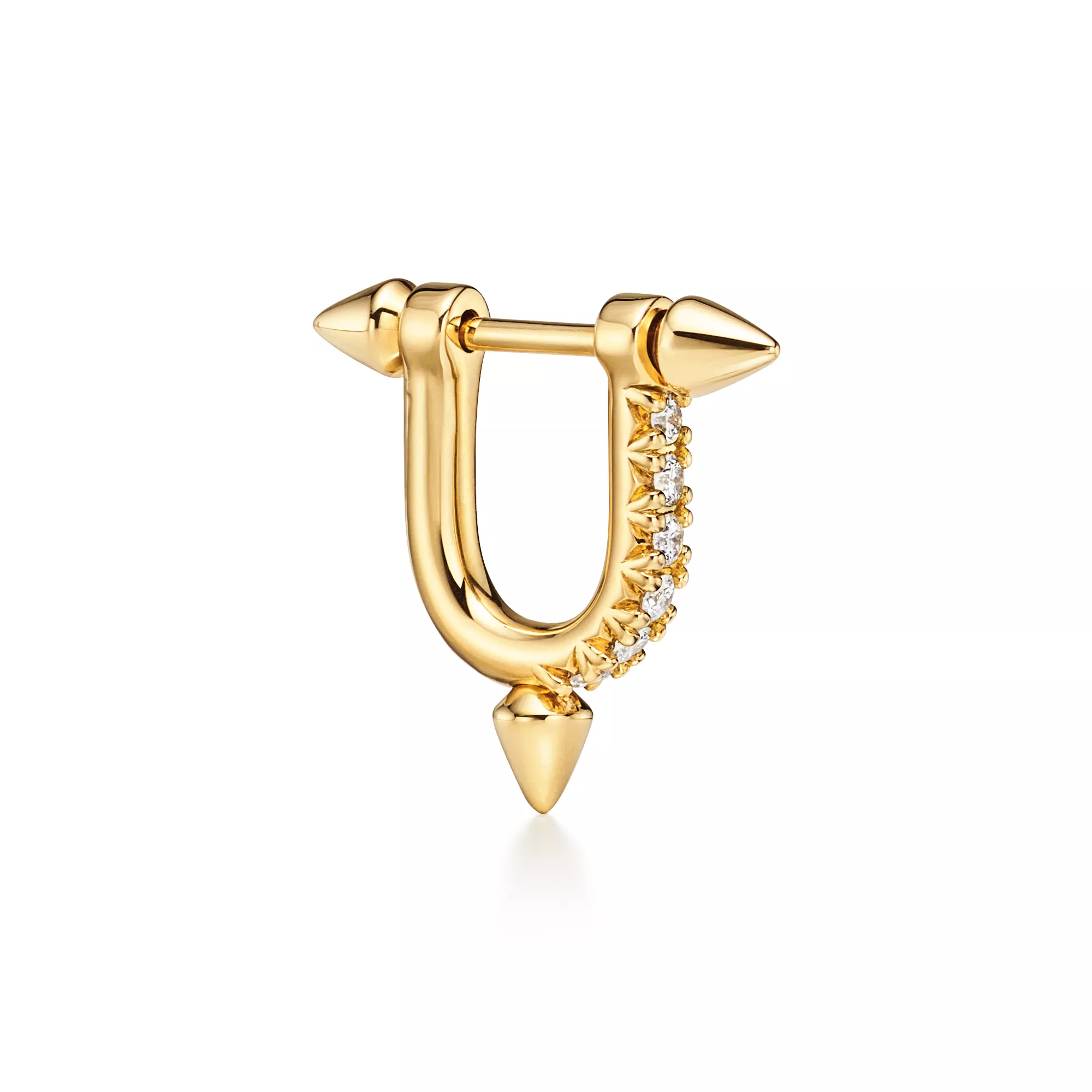 La collezione Tiffany Titan by Pharrell Williams esprime il potere della ribellione come motore della creatività, portando avanti la tradizione della Maison nel collaborare con artisti visionari. Questi gioielli traggono ispirazione da Poseidone e dal suo tridente. Il motivo a punte e le maglie delicatamente sagomate sono realizzati in oro e creano un effetto straordinario. I diamanti pavé, che consentono alla luce di penetrare da ogni angolazione, aumentano al massimo la luminosità del gioiello. Per un look diverso, questi orecchini possono essere facilmente trasformati in orecchini a bottone in oro.