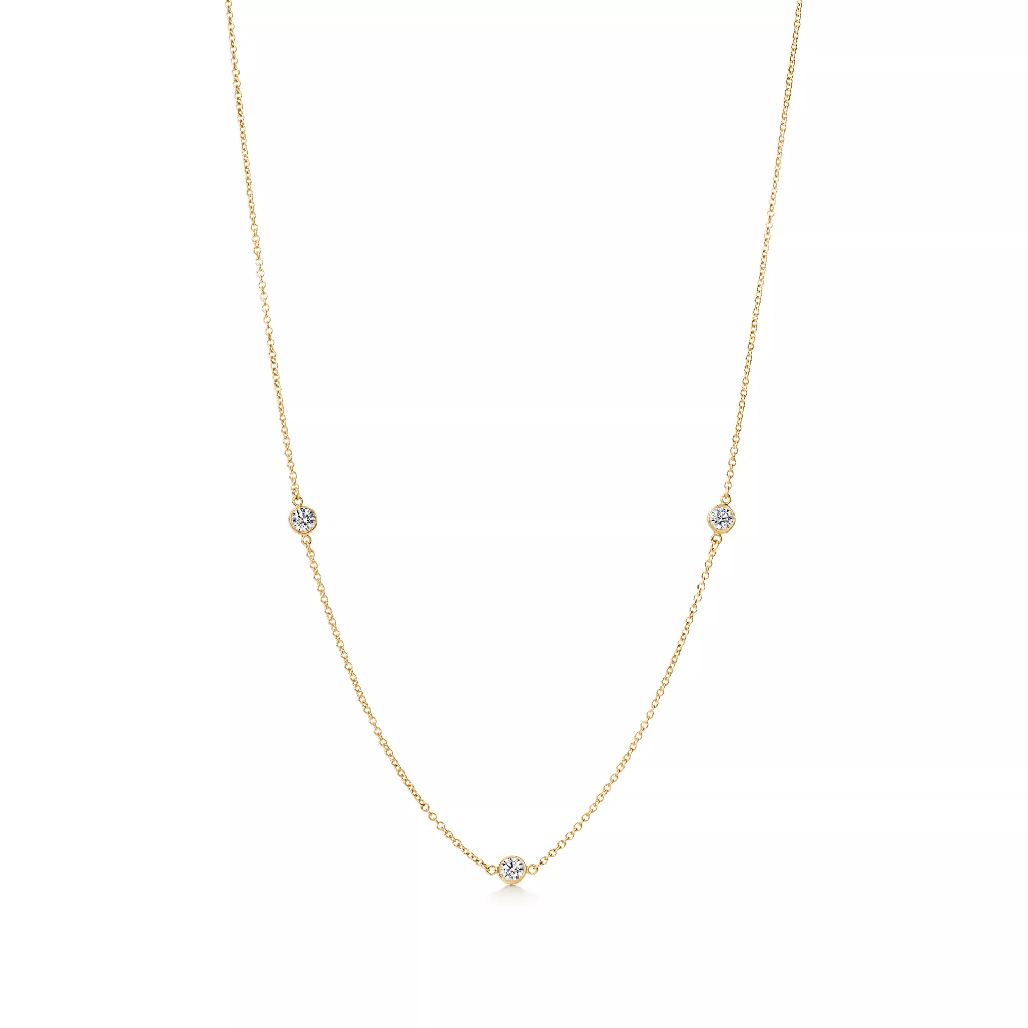 Collana, in oro 18 ct e tre diamanti tondi taglio brillante. Lunghezza 46 cm. Peso complessivo in ct 0,30. Creazioni originali con copyright di Elsa Peretti®.