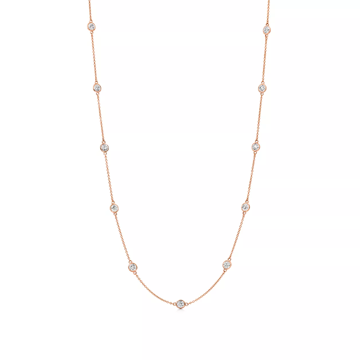 I diamanti tondi Tiffany catturano la luce e la fanno danzare. Collana in oro rosa 18k e 11 diamanti taglio brillante. Lunghezza 40,50 cm. Peso complessivo 1.54 ct. Modelli originali di Elsa Peretti coperti da copyright.