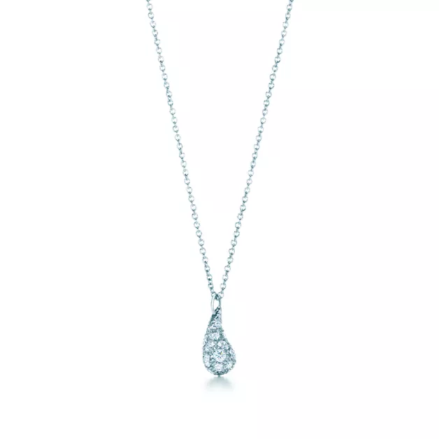 Fa venire in mente una goccia di pioggia o una luminosa perla di rugiada mattutina. Pendente in platino con diamanti taglio brillante. Su catena da 40,6 cm. Peso complessivo in carati 0,75. Modelli originali di Elsa Peretti® coperti da copyright.