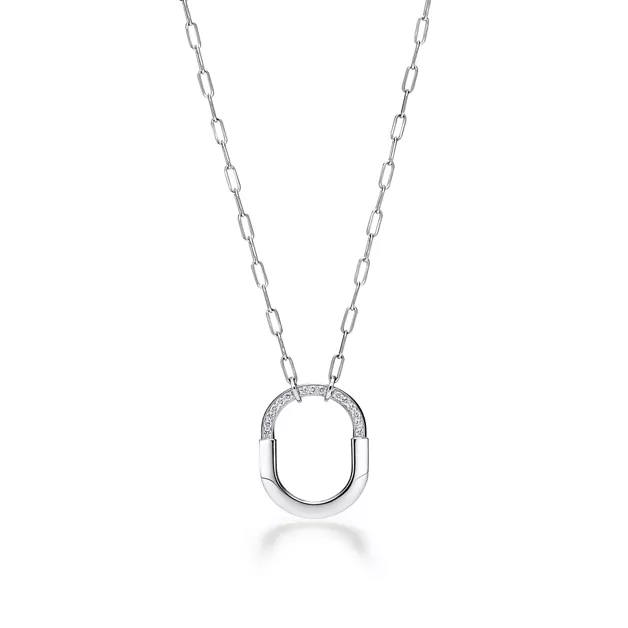 Lock by Tiffany esprime l’inesauribile potere dell’amore e si ispira a un lucchetto degli Archivi Tiffany risalente al 1883. Pensata per tenere al sicuro ciò che è per noi più prezioso, Lock è un simbolo universale di quello che conta di più. Questo pendente ha una splendida catena a maglie ovali che richiama il motivo della collezione Lock. È superbamente realizzato in oro bianco con diamanti incastonati a mano.