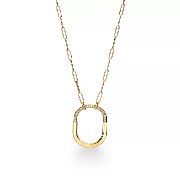Lock by Tiffany esprime l’inesauribile potere dell’amore e si ispira a un lucchetto degli Archivi Tiffany risalente al 1883. Pensata per tenere al sicuro ciò che è per noi più prezioso, Lock è un simbolo universale di quello che conta di più. Questo pendente ha una splendida catena a maglie ovali che richiama il motivo della collezione Lock. È superbamente realizzato in oro giallo con diamanti incastonati a mano.
