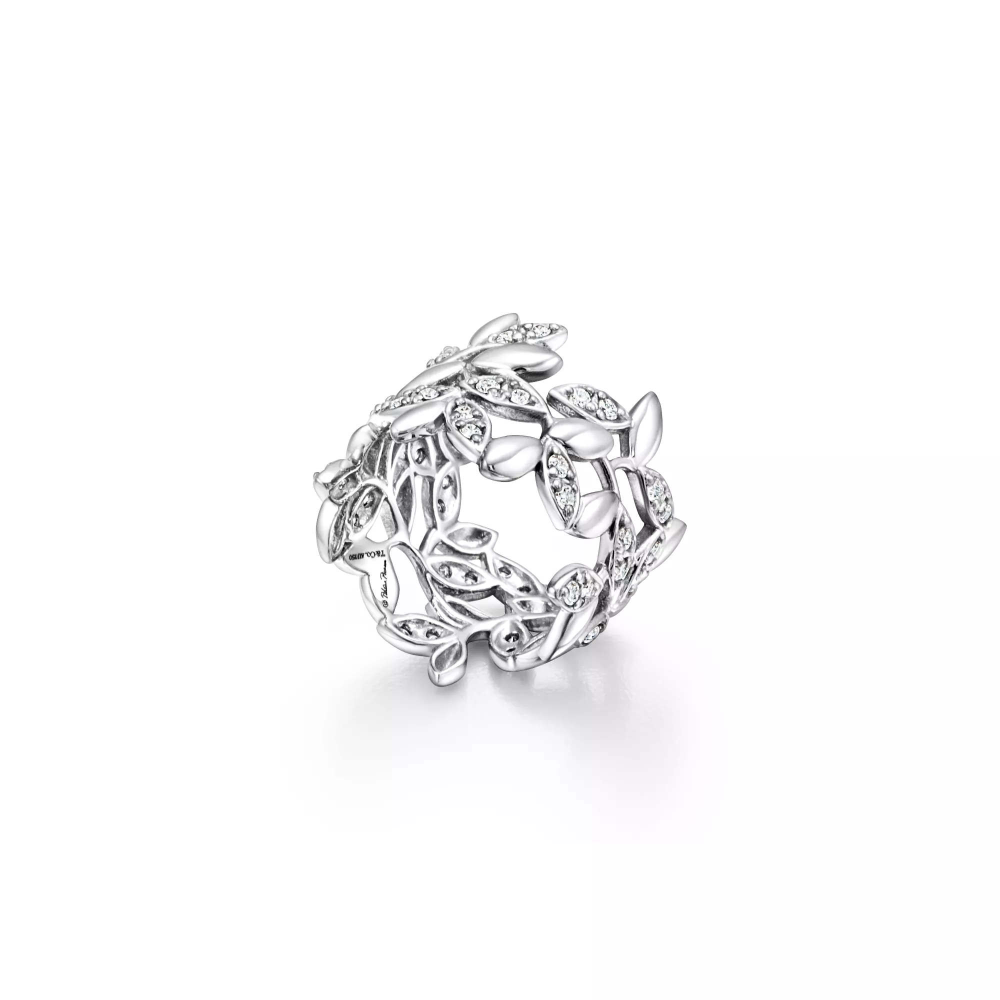 Con le sue foglie di diamanti meravigliosamente scolpite, Paloma celebra il ramo d'ulivo, simbolo di pace e abbondanza. Fedina in oro bianco 18k con diamanti tondi taglio brillante. Peso complessivo 0.46 ct. Creazioni originali con copyright di Paloma Picasso®.