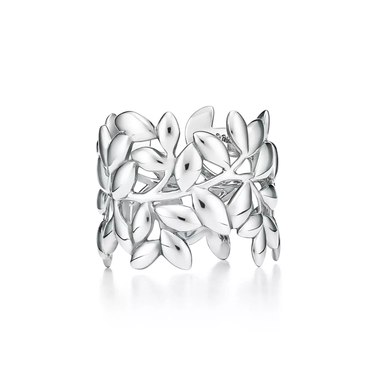 Con foglie meravigliosamente scolpite in argento, Paloma rende omaggio al ramo d'ulivo, simbolo di pace e abbondanza. Fedina in argento. Modelli originali di Paloma Picasso coperti da copyright.