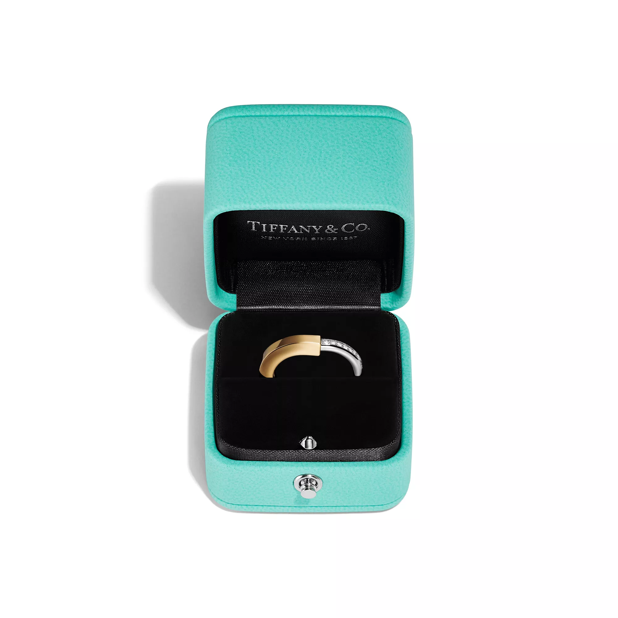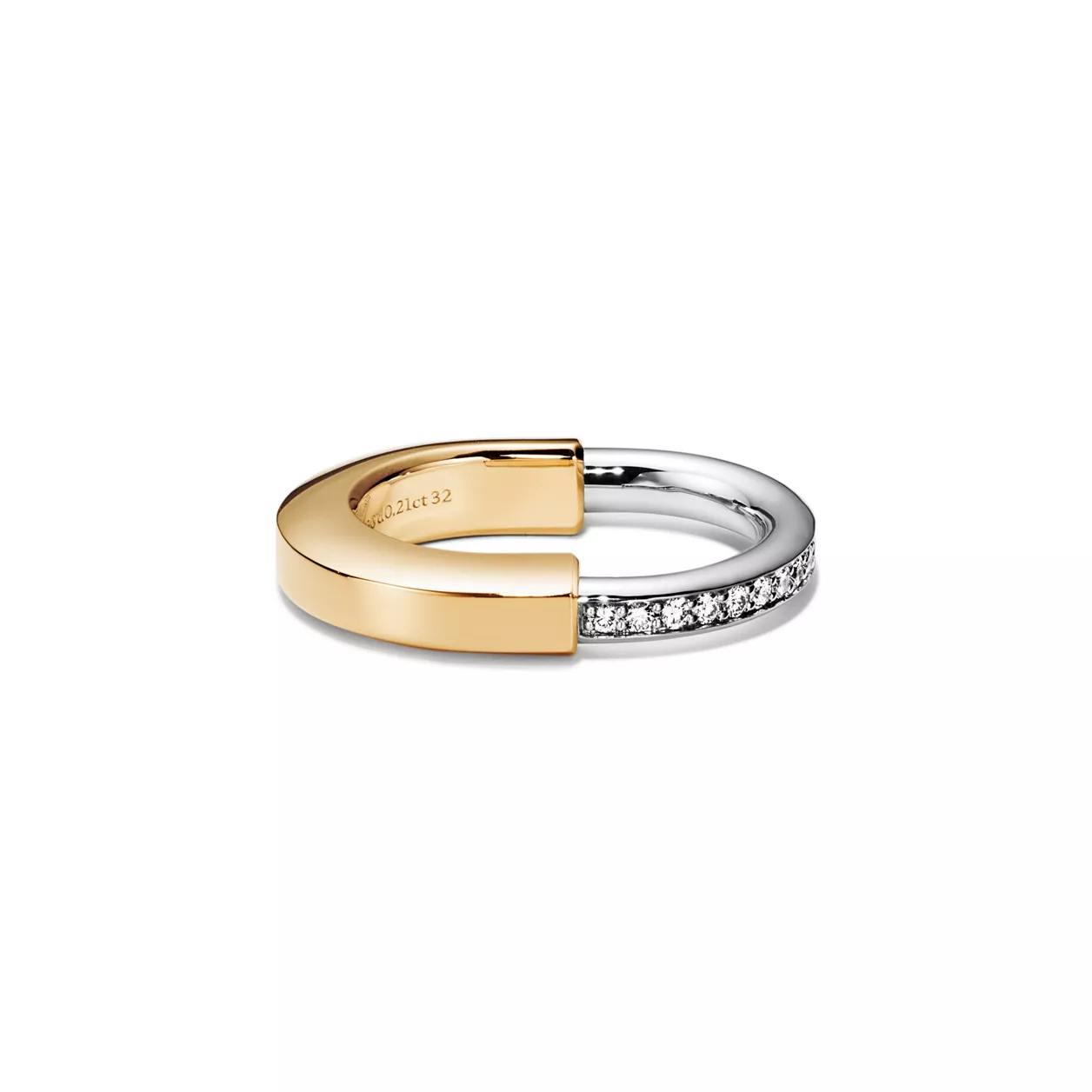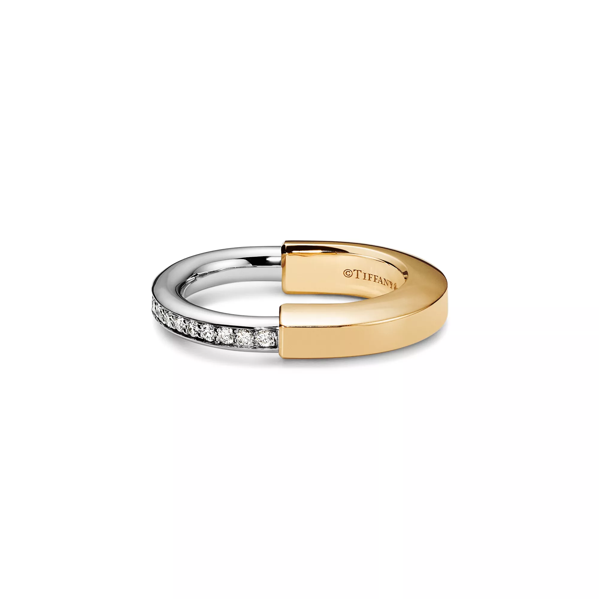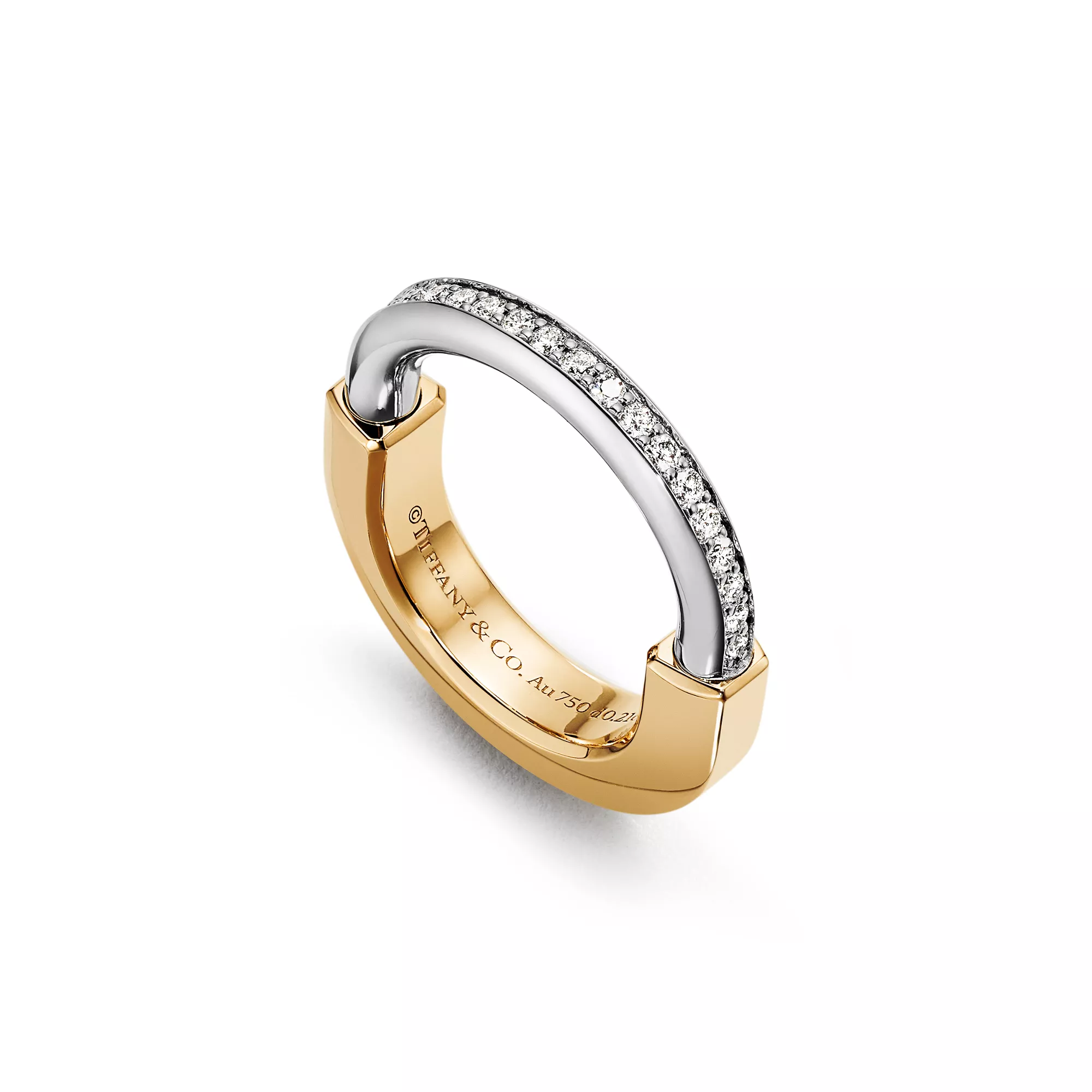 Ispirata alla forza dell’unione e dell’inclusività, la collezione Tiffany Lock è un forte simbolo dei legami personali che fanno di noi quello che siamo. I modelli Tiffany Lock, pensati per tutti i generi, sono ispirati a un lucchetto, un motivo importante degli Archivi Tiffany. Questo anello è superbamente realizzato in oro giallo e bianco con diamanti incastonati a mano. Può essere indossato da solo per una straordinaria dichiarazione di stile o abbinato ai tuoi anelli preferiti.